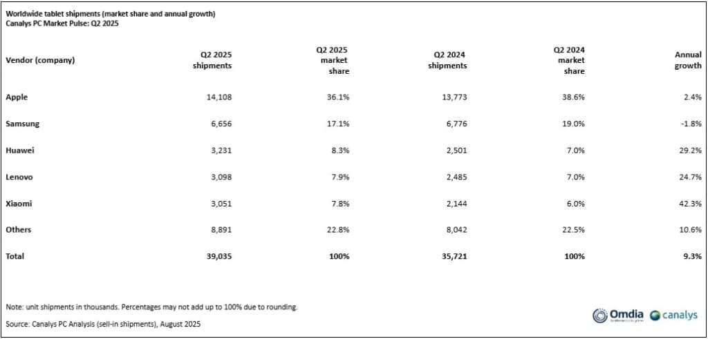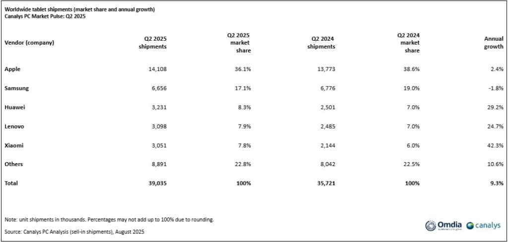 Según los últimos datos de Canalys, los envíos mundiales de tabletas alcanzaron los 39 millones de unidades en el segundo trimestre de 2025, con un crecimiento anual del 9 % y un aumento secuencial del 5 %. Este sólido desempeño fue impulsado principalmente por una demanda saludable en China y en la región EMEA (Europa, Oriente Medio y África).