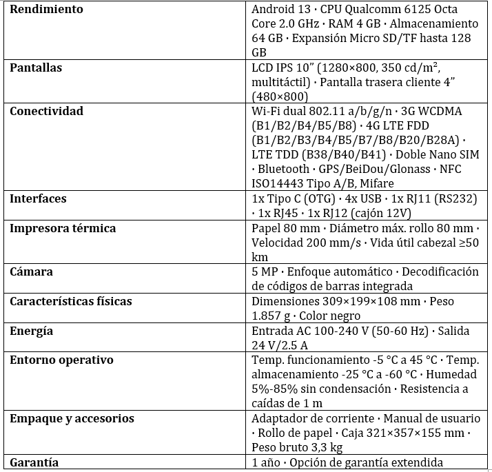 El equipo está orientado a acelerar transacciones, mejorar la atención al cliente y facilitar la gestión de inventarios, aportando a la eficiencia de los negocios que buscan soluciones de alto rendimiento en un solo dispositivo y es ideal para tiendas minoristas, foodtracks y muchas otras aplicaciones
