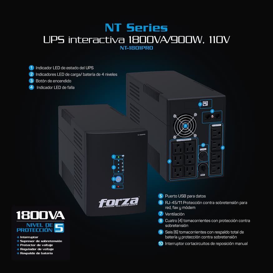 Forza NT-2401PRO: UPS interactiva de 2400VA/1200W con mayor capacidad de potencia, diseñada específicamente para pequeños servidores, equipos críticos de oficina y cargas más exigentes que requieren protección profesional. Ofrece capacidad ampliada para aplicaciones profesionales que demandan respaldo extendido y mayor potencia de salida.