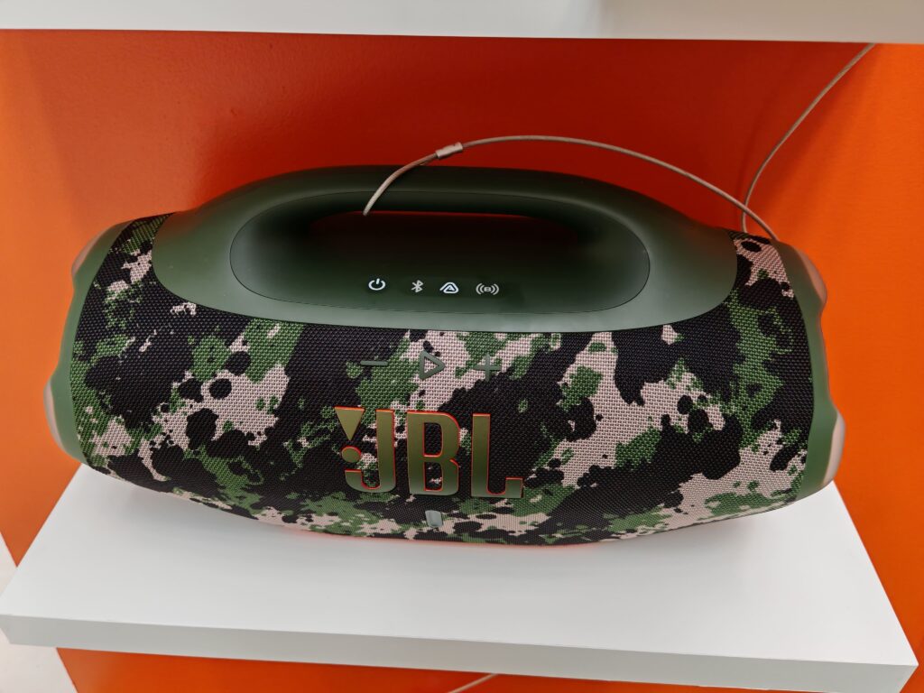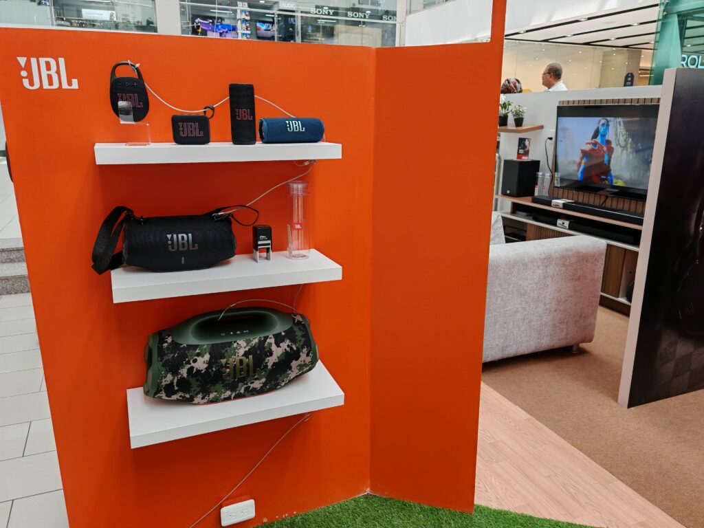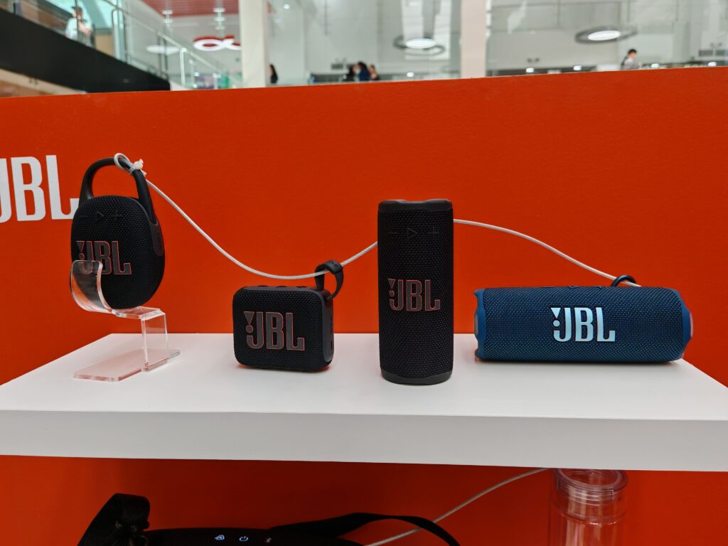 En la tercera zona, JBL mostró su ecosistema de auriculares convencionales y parlantes portátiles, pensados para uso diario dentro y fuera del hogar.